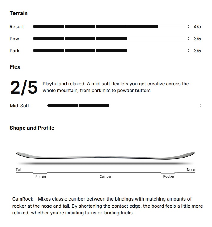The Merc’s playful feel will inspire you to take your riding to the next level. Its secret sauce is the CamRock profile that smooths turn initiation and gives great edge hold without feeling too aggressive. We’ve paired it with a mellow flex pattern which makes it easy to load presses, but thanks to Pop Carbon inlays at each end there's a ton of ollie power on tap. It's a super versatile model and a constant team favorite, from the park to the backcountry.