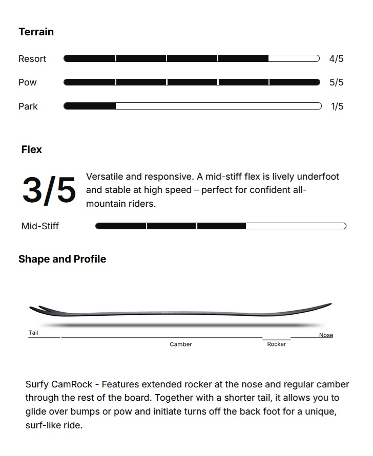 - Full-length carbon inlays amplify the board's response and keep the ride smooth even when you're pushing mach 10.