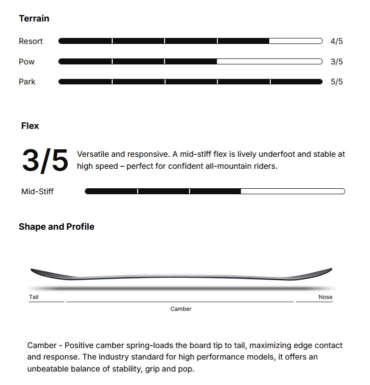 Pop Carbon is deployed on both sides of the core and from tip to tail, beefing up the flex. Ideal for aggressive riders who want snappy edge response, tons of pop and a smooth ride at high speeds.