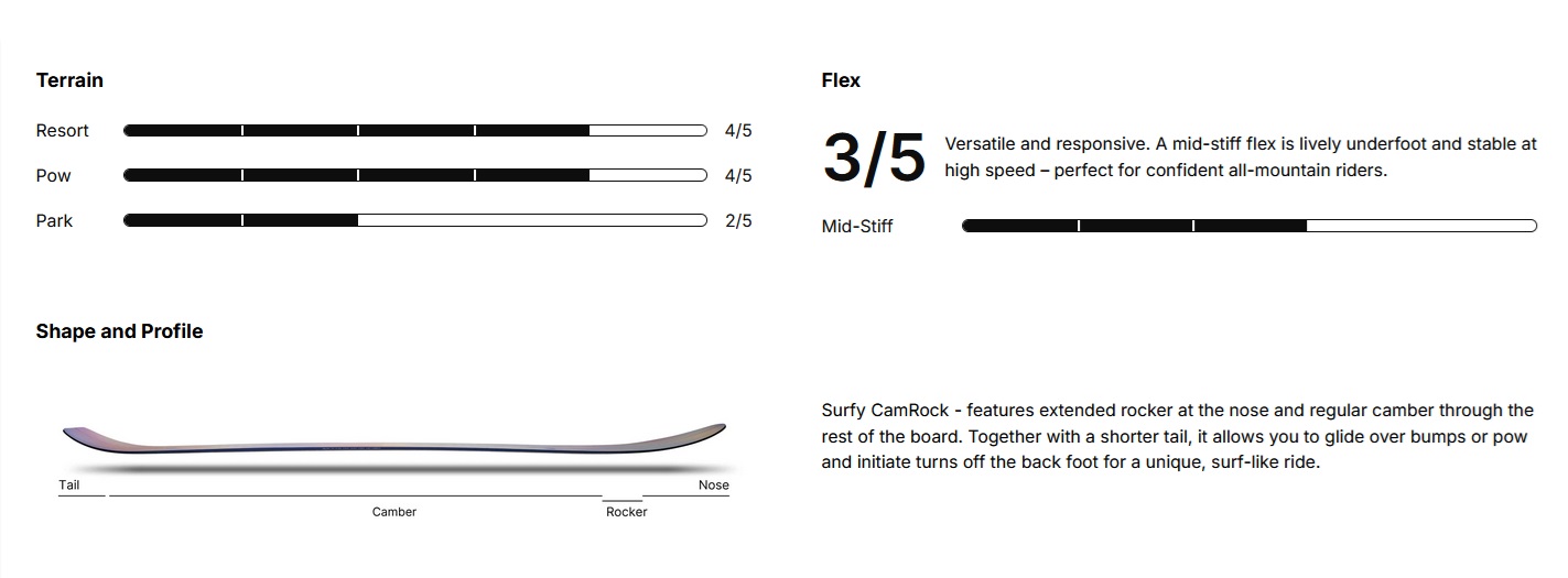 One of our most popular directional boards, the Mellow brings equal parts grace and power to the Snow.Surf quiver. This is a timeless-looking craft for connecting with every turn and feeling your way down the fall line. Camber underfoot, a mid-stiff flex and aggressive sidecut keep it spicy in resort, but with more volume at the nose and early-rise rocker it drives easily through carves and truly glides in pow.